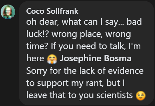 “oh dear, what can I say… bad luck!? wrong place, wrong time? If you need to talk, I’m here 🤗”