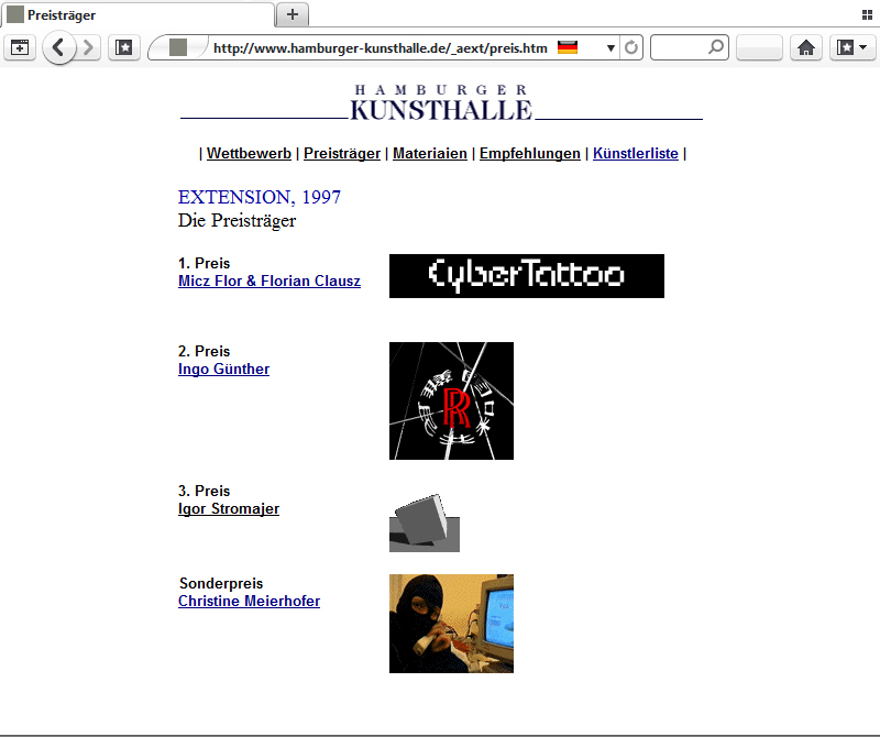The Extension competition was organized in 1997 by the Hamburg Kunsthalle as an international net art contest.