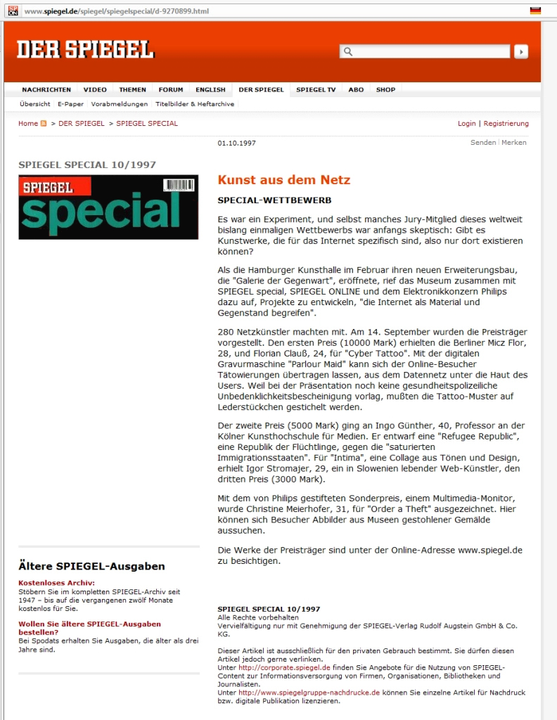 ↑ Der Spiegel: Kunst aus dem Netz, 1 October 1997