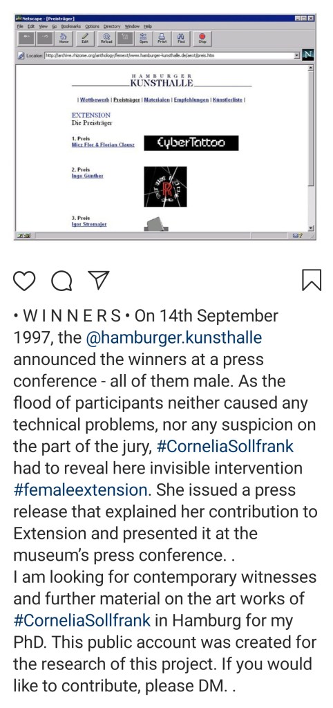 Female Extension and Net Art Generator are among the most important net art works ever made. I have enthusiastically shown and discussed both works with art students around the world on multiple occasions. Although we never met in person (edited: until December 2025), I collaborated with her online a couple of times. We never spoke directly about Extension ’97. But in November 2019, Sollfrank commented on my Facebook post about it for the first and only time, replying to me directly with a remark: