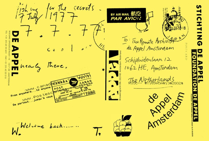 The book features materials by more than a hundred different authors and includes paper-based and digital correspondence by, amongst many others, Laurie Anderson, James Lee Byars, Theresa Hak Kyung Cha, General Idea, Mona Hatoum, Patricia Kaersenhout and Carolee Schneemann. Context is provided by written guest contributions by Alice Butler, Alison Burstein, Annet Dekker, Susan Gibb and Brian Fuata and de Appel’s archivist Nell Donkers. In their texts they depart from their own specific perspectives on correspondence and archival practices, which function as a doorway or bridge to a specific range of correspondence material. An edition by Alison Knowles in the shape of a ribbon forms a special prompt to the reader of the book.